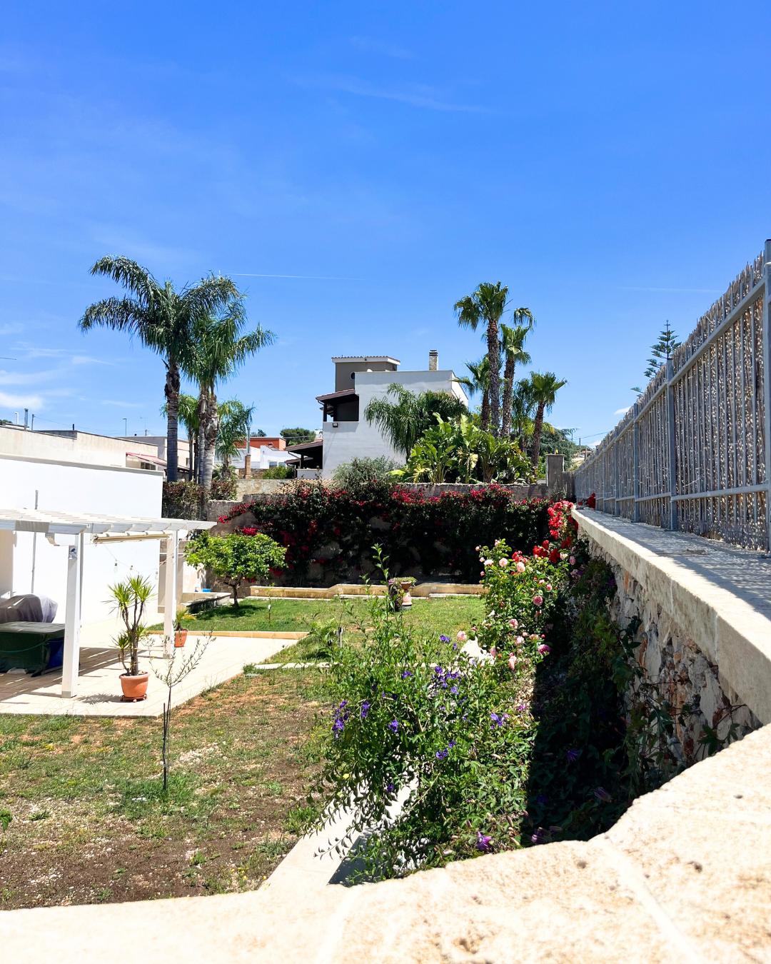 Per questo progetto abbiamo scelto colori luminosi e materiali locali, come la pietra leccese, per caratterizzare gli spazi e creare una continuità dei luoghi interni ed esterni, in linea con la tradizione edilizia locale. E’ stata fatta una accurata progettazione degli spazi esterni, limitando i confini della proprietà con un muretto a secco su tutto il perimetro.
